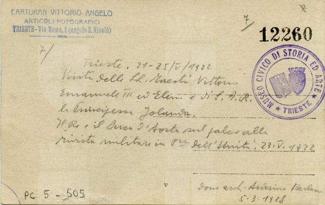 Vittorio Emanuele III, la regina Elena e la principessa Iolanda alla rivista militare in piazza dell'Unità d'Italia il 23 maggio 1922. Vi si vedono il Re e il Duca d'Aosta sul palco allestito in piazza.