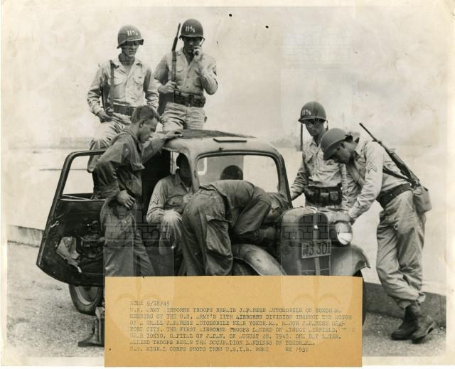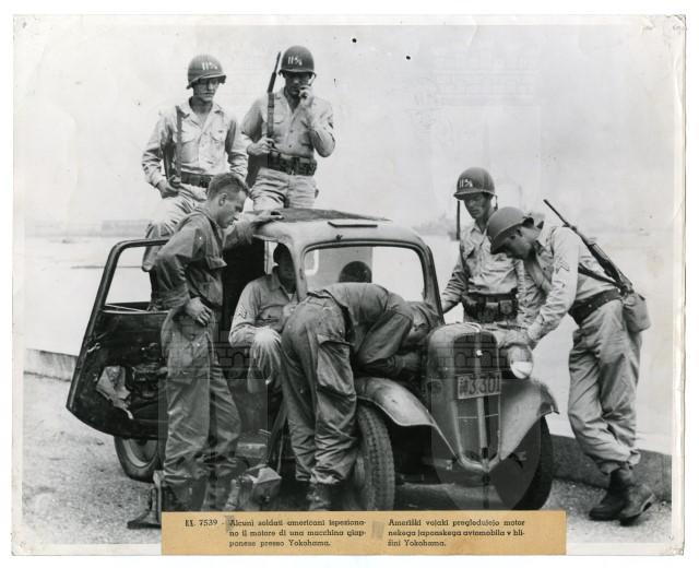 Una truppa americana dell'undicesima divisione aerea ispeziona il motore di un'automobile giappponese nella città di portuale di Yokohama, invasa il 29 agosto 1945.