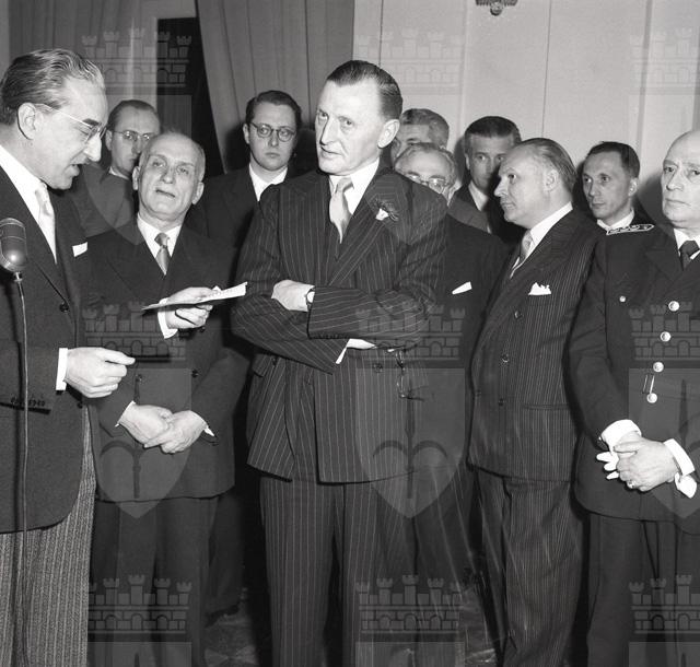 Con una solenne cerimonia in Prefettura, il maggior generale inglese sir Terence Airey si congeda dalle autorità politiche cittadine (da: Trieste 1900-1999: cent'anni di storia, v. 6, p. 184)