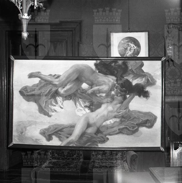 Due dipinti, Piramide di fiori a San Giusto di Ugo Flumiani e Le campane della redenzione di Carlo Wostry, fotografati in una sala del Civico Museo Morpurgo. Il dipinto di Wostry venne esposto per la prima volta al Caffe degli Specchi il giorno dell'annessione di Trieste all'Italia.