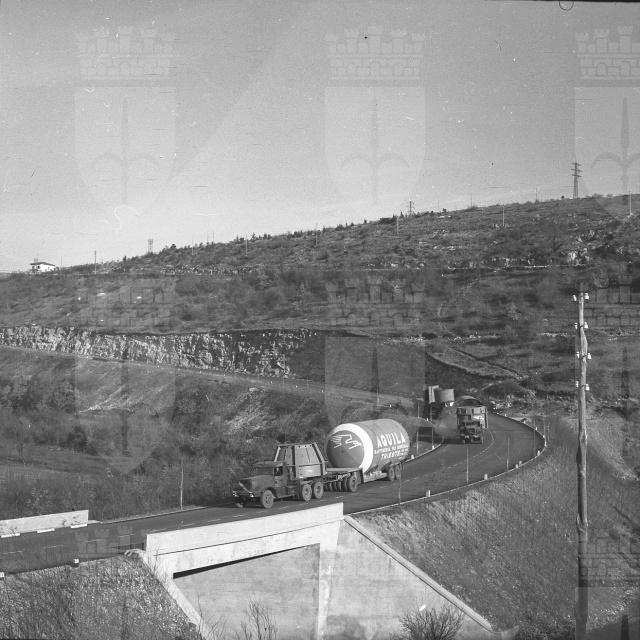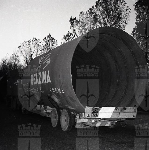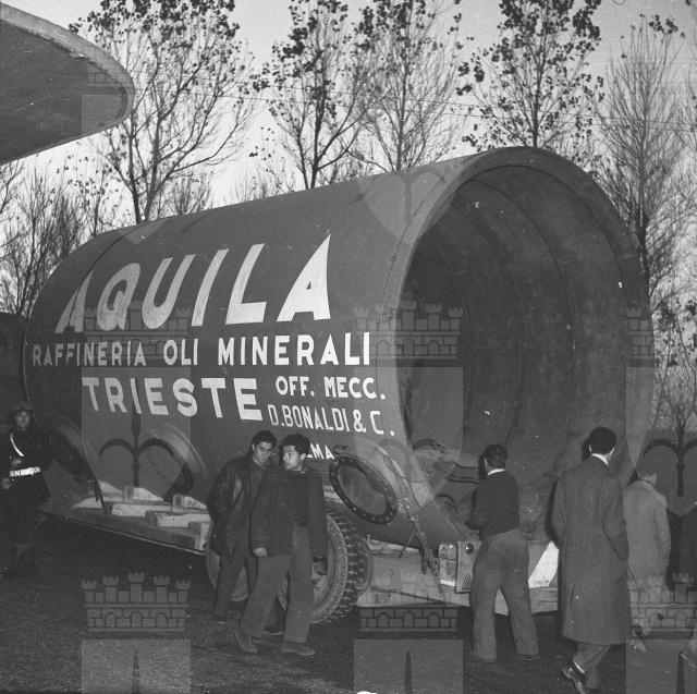 Tre camion rimorchio, giunti da Crema, trasportano un grande serbatoio destinato alla Raffineria Aquila. Il vuoto e' composto da un primo elemento lungo m 7,5 e del diametro di m 3,80, peso circa 20 tonnellate, e da un altro elemento analogo e della struttura metallica del forno. E' il primo impianto del genere costruito in Italia, su disegno di una ditta di Boston