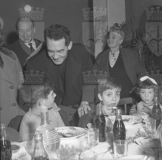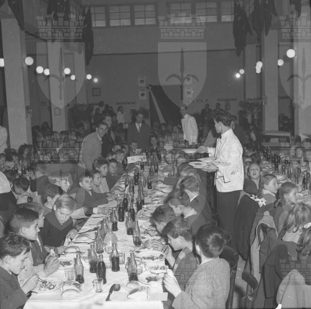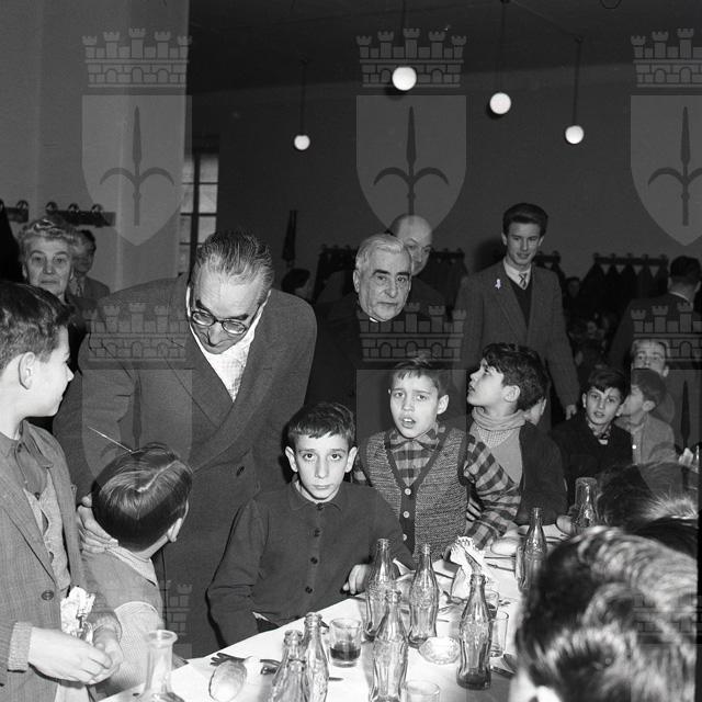 Oltre 700 bambini di eta inferiore ai 12 anni, profughi giuliano-dalmati, appartenenti alle classi piu indigenti, partecipano ad un pranzo natalizio offerto dal locale Ente organizzatore dell'Amministrazione per gli aiuti internazionali, nei locali della mensa comunale di via Gambini