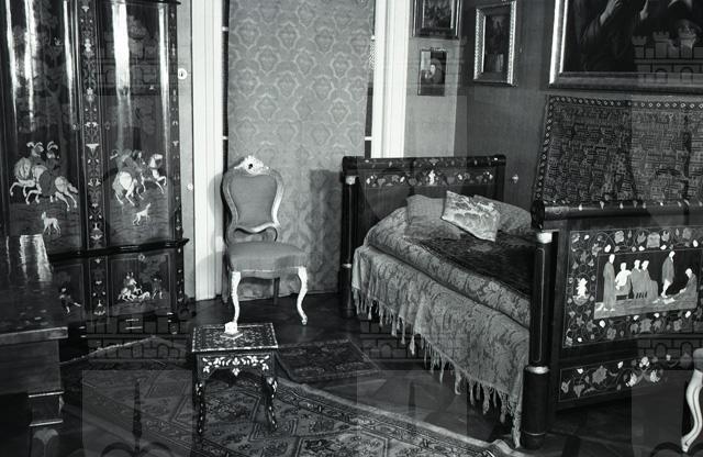 La splendida camera da letto di Draga Obrenovic, regina di Serbia, moglie del re Alessandro, composta da mobili olandesi intarsiati d'avorio. Draga e Alessandro, convolati a nozze nel 1900, furono assassinati la notte del 10 giugno 1903, proprio in questo letto: una congiura di palazzo pose fine alla dinastia degli Obrenovic, per insediare sul trono Pietro Karageorgevic. La camera appartenne a una nobile famiglia triestina e fu poi venduta a un celebre antiquario che la riallesti in una villa di viale Terza Armata, dove fu fotografata.