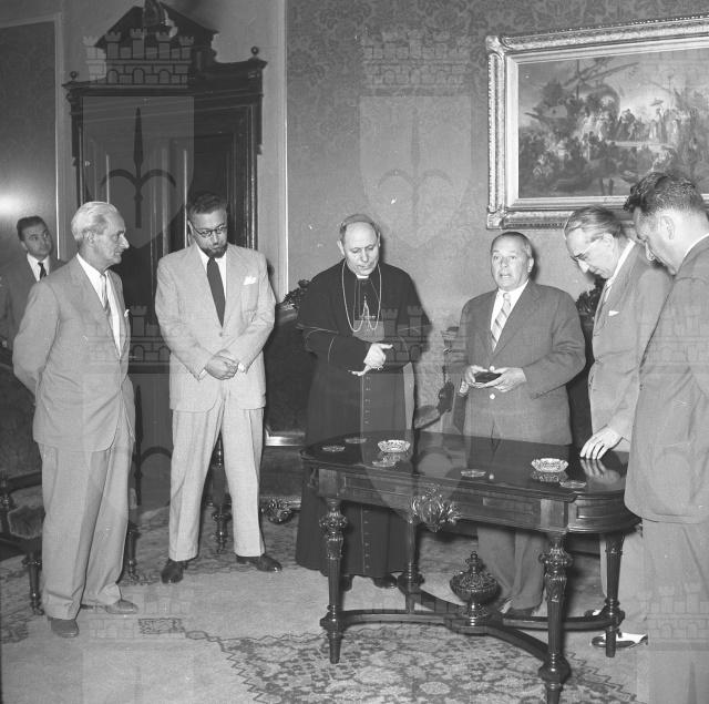 Congedo in forma ufficiale del dott. Renato Timeus, dal 1914 funzionario dell'amministrazione comunale di Trieste alla presenza del segretario generale del Comune Sacchi, del prof. Sciolis, del vescovo Santin e dell'ing. Visentin (Da: Rivista mensile della citta di Trieste, 10.9.1953)