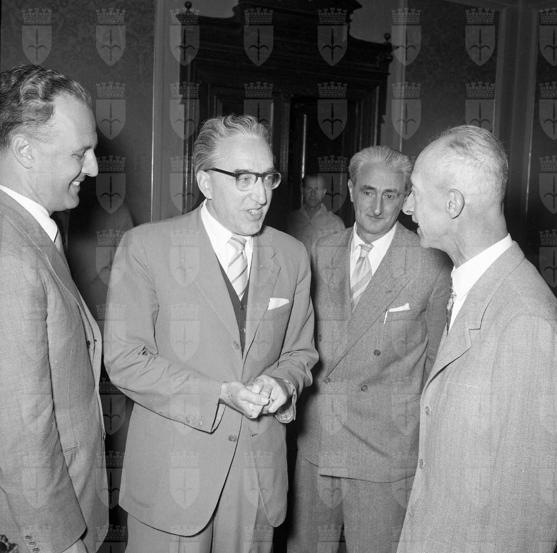 Cerimonia di congedo del dott. Paolo Schlechter, funzionario assunto al Comune dal 1913. Nel 1924 fu incaricato dell'assistenza legale quale funzionario giurisperito presso l'Ufficio Sanità e igiene. Nominato segretario caporeparto nel 1935, resse il Reparto licenze commerciali e, nominato capo Ripartizione sanità e igiene e, successivamente, dal 1949, la Divisione amministrativa della Ripartizione lavori pubblici. (Da: Rivista mensile della citta di Trieste, 1953)
