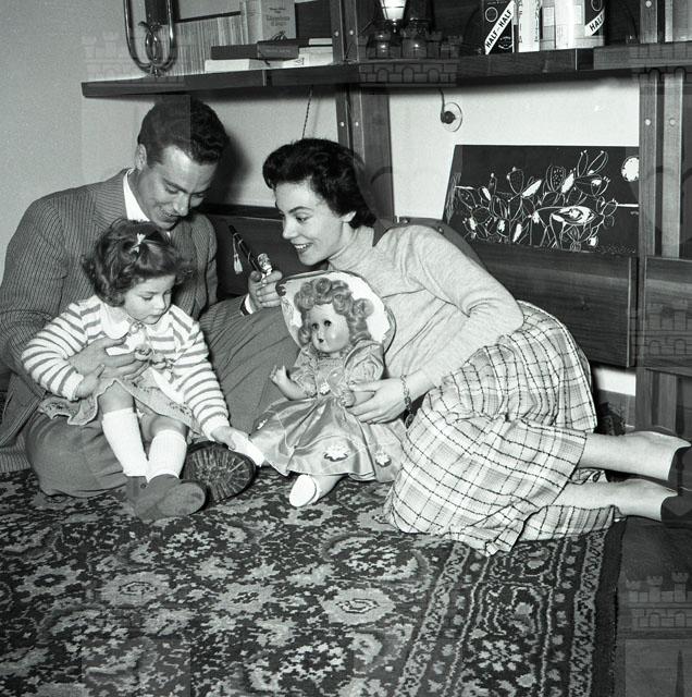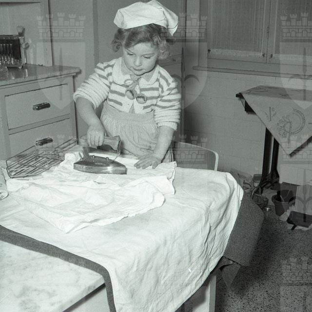 Bambina immortalata mentre stira e gioca con i genitori