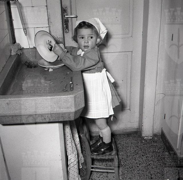 Bambina impegnata a lavare i piatti e al telefono