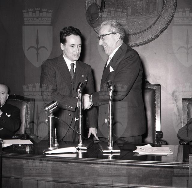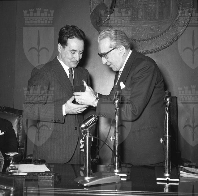Il capitano Guido Musitelli, ufficiale triestino del 3. Reggimento artiglieria alpina della Julia, rientrato a casa dopo dodici anni di prigionia in Russia, viene ricevuto dal sindaco Bartoli