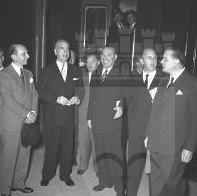 Il prosindaco, ing. Raimondo Visintin, saluta alla partenza per Roma il consigliere politico italiano ministro Cristoforo Fracassi. Una delegazione della giunta comunale parte per Roma, per partecipare alla seduta del Consiglio dei Ministri e per ricevere la bandiera italiana dalle mani del presidente della Repubblica, Luigi Einaudi (dal Giornale di Trieste, 5 ottobre 1954).