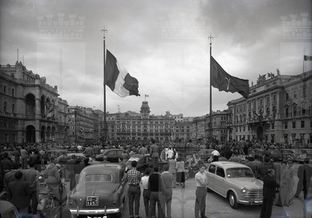 In piazza Unita' d'Italia la folla si riunisce in attesa dell'annuncio della firma a Londra del Memorandum d'intesa che assegna Trieste all'Italia.