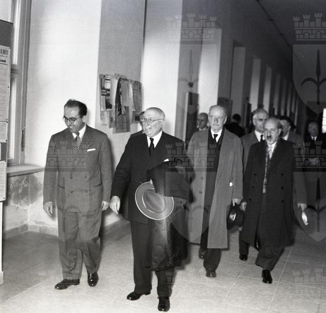 Una delegazione di 18 dei 150 studenti che nel 1904 si batterono a Innsbruck per chiedere l'istituzione a Trieste dell'Università italiana sono stati ricevuti dal Sindaco dopo aver deposto una corona d'alloro sulla lapida di Via Filzi ed essere stati accolti dal rettore dell'Università, Rodolfo Ambrosino. Testo tratto dal Piccolo sera, 16.11.1954.