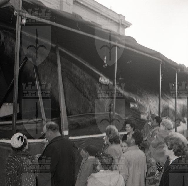 La gigantesca balena Golia, tra i più grandi esemplari al mondo, catturato nei mari della Norvegia ha una lingua che pesa quanto un elefante, ossia 2200 kili, un cuore di cinque quintali e mezzo e il peso di 62.000 kili, è lunga 22 metri. Il gigante degli Oceani viene esposto per quattro giorni, dal 6 al 9 novembre in Riva Nazario Sauro, vicino alla Pescheria. Testo tratto da Il Piccolo, 6.11.1954