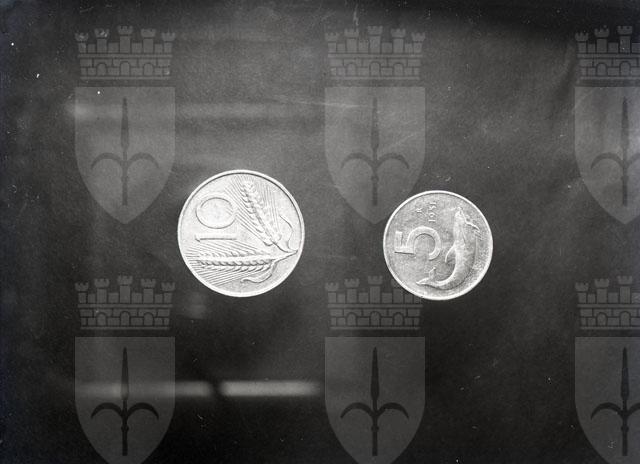 Riproduzione fotografica di monete da 5 e 10 lire.