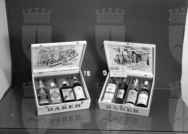 Cassette natalizie di liquori della Baker s.p.a. di Trieste.La ditta Baker venne fondata a Londra nel 1898 da Arthur Arnold Baker e suo cugino George, specializzandosi nell'importazione, imbottigliamento e vendita di rum. Il 7 ottobre 1907 apre la filiale di Trieste, con stabilimento nel rione di Barcola dove venivano miscelati diversi tipi di rum centro-americano di altissima qualita', autentici distillati di canna di zucchero demerara, che venivano venduti in bottiglie con etichette dalla grafica poco comune. Il rum di Baker - l'Australian Rum e il Battle Axe Jamaica Rum - era particolarmente popolare tra i marinai delle navi inglesi che facevano scalo a Trieste, maggior porto dell'impero austro-ungarico. Ed altrettanto richiesto e diffuso nelle piu' qualificate pasticcerie di Vienna, Praga e Budapest per la confezione di dolci. Rifugiatosi in patria durante la 1. guerra mondiale, A.A.Baker rientra a Trieste nel 1918 riaprendo la stabilimento.Dopo numerosi passaggi di proprieta', la ditta fu trasferita nel 1983 a Gorizia per il particolare regime fiscale di alcuni componenti base (alcool, zucchero).