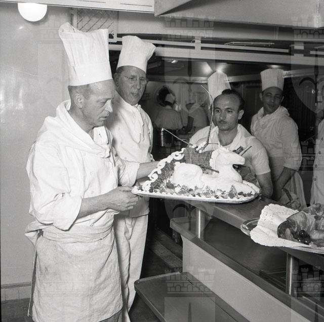 Croceristi ripresi sulla nave. Gli interni della Motonave Victoria: la cucina, il ristorante, la sala da ballo.