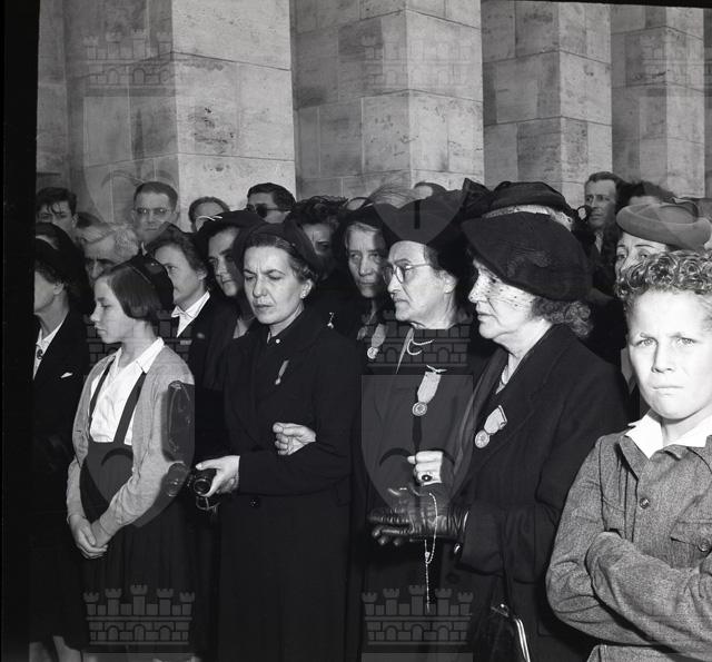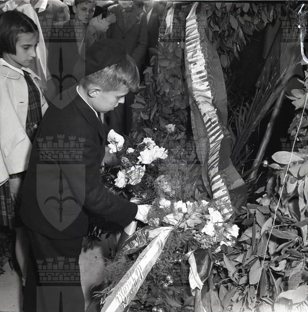 Folla presenzia alla cerimonia di inaugurazione dell'Ara Pacis Mundi di Medea. Cartellone sul muro di una casa: Sottocentro fecondazione artificiale. Uomo al volante di un'automobile