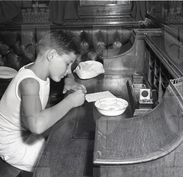 La nave scuola Giorgio Cini dell'Istituto Nautico di Venezia attraccata al molo Audace. Si tratta di un brigantino a tre alberi adibito a nave scuola dal Centro di Cultura marinara della Fondazione Cini e destinato ad accogliere 200 bambini di marinai e pescatori. Foto del comandante, la medaglia d'oro Giovanni Bardini, con alcuni visitatori. Riprese di un bambino alla scrivania, a bordo della nave.