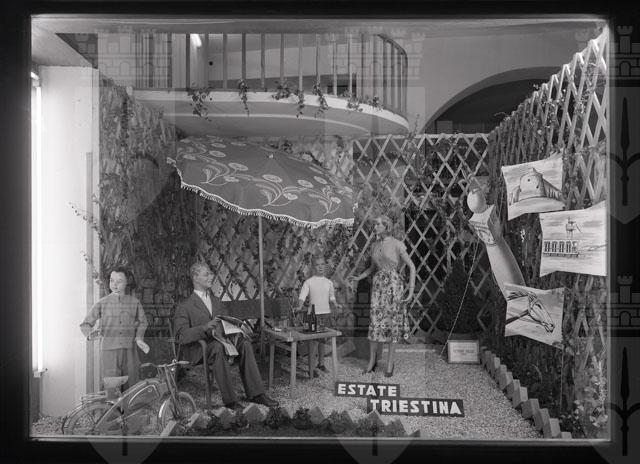 Le vetrine espongono l'ombrellone e sono titolate "Estate triestina"