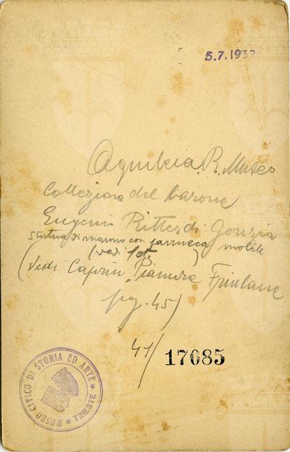 Testa femminile con parrucca mobile di piccole dimensioni (9,5 cm) realizzata in basalto. Si tratta di un ritratto idealizzato di giovane donna alla quale i tratti fisionomici ben marcati - quali il volto largo, gli occhi leggermente sporgenti con le pupille e le iridi incise, le labbra leggermente socchiuse - conferiscono volutamente un "carattere" che la distanzia dalla fissità propria dei tipi di divinità. Dibattuta è la sua identificazione e cronologia: G. Brusin la ritiene un "tipo ideale, generico" di fine II sec. d.C. mentre F. Squarciapino ne propone un'attribuzione all'età antonina e vi riconosce, per confronto con la statuaria di dimensioni maggiori, il ritratto di Faustina Minore. La studiosa collega inoltre la diffusione di queste piccole immagini al culto dei lari, per il quale sovente si ricorreva ai genii degli imperatori. La fotografia ritrae il medesimo soggetto della foto F17084, alla quale si rimanda per ulteriori considerazioni. La fotografia è stata utilizzata da V. Scarpa per realizzare il disegno pubblicato nel volume di Caprin, "Pianure friulane" (1892), che la riproduce a fianco del soggetto della foto F17084.