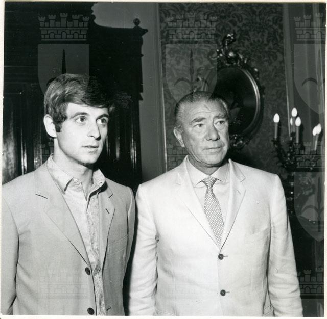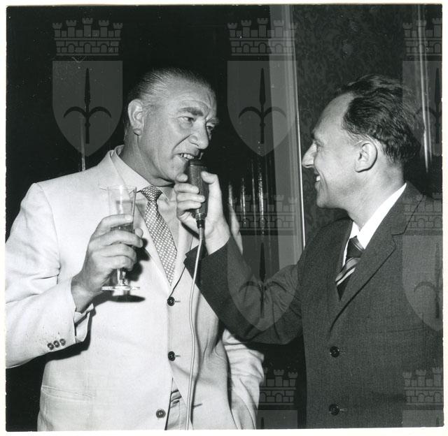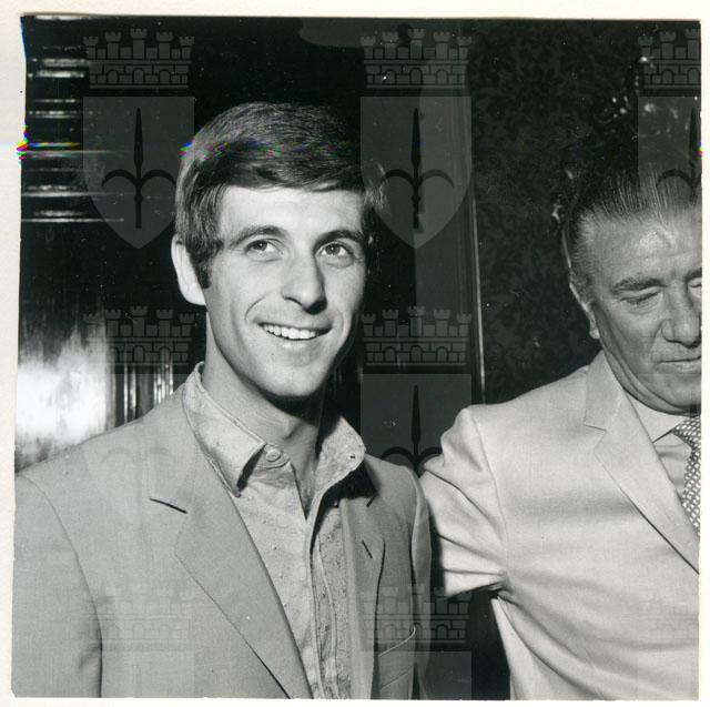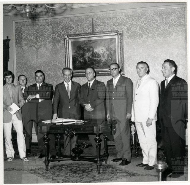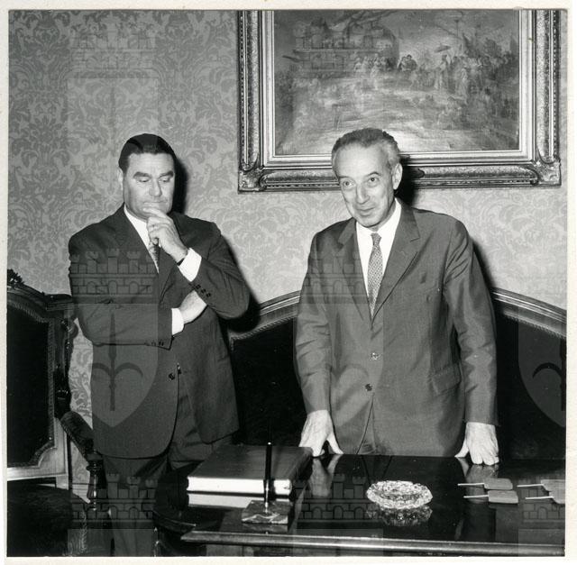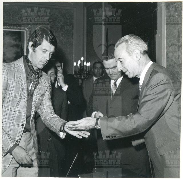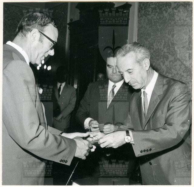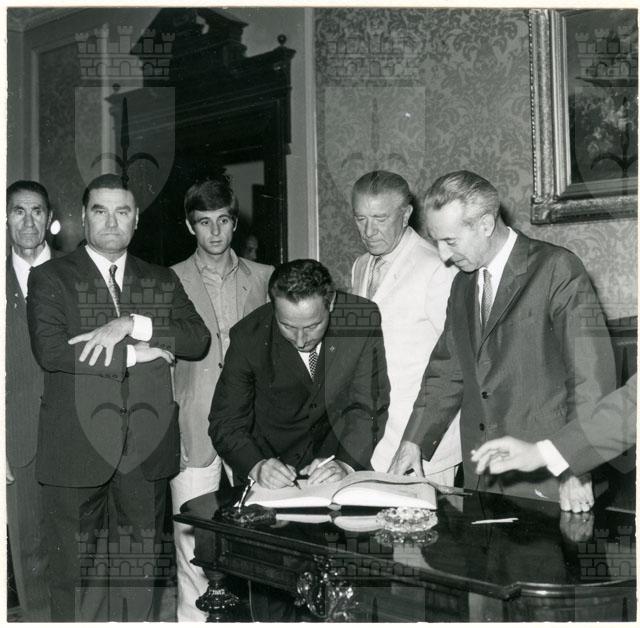 Il Sindaco ing. Spaccini riceve l'ospite accompagnato da Valcareggi, Maldini, Rivera