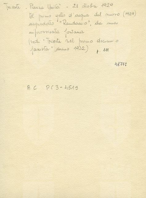 Ideale prosecuzione dell’acquedotto romano di Aurisina e Teresiano del Settecento, il “Randaccio”, dedicato all'eroe di guerra Giovanni Randaccio caduto sul Carso, fu l’ultimo acquedotto costruito a Trieste nel 1929. Con la sua costruzione si riuscì ad inviare verso la città 75 mila mc giornalieri attraverso la nuova adduttrice DN900 posta lungo il sedime della Strada Costiera. Il sito di “Randaccio” venne poi potenziato nel 1947, 1952 e 1971 con un raddoppio di linea sottomarina ed accogliendo nuove tecnologie ed impianti, nonché con lo sfruttamento delle risorgive del Timavo (oggi utilizzate solo come riserva), ma senza mai mutare l’assetto iniziale degli anni Venti e Trenta del Novecento. Ad oggi l’impianto ha una potenzialità media giornaliera di 110.000 mc. La manifestazione, durata pochi istanti, viene celebrata in Piazza Unità alla presenza del ministro delle colonie Emilio De Bono.