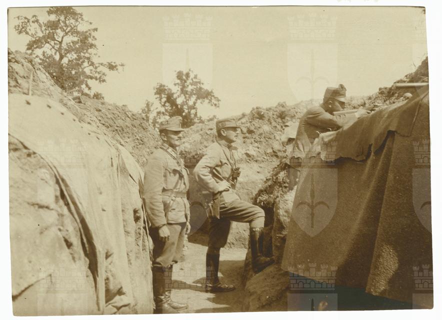 Trincea a Korytnytsia, distretto di Lokachi, costruita dallo squadrone tecnico del 12. Reggimento Ulani dal 20 al 27 luglio 1916. Al centro il capitano di cavalleria Pistor. Si tratta dello stesso scatto stampato in momenti diversi, con commenti diversi manoscritti sul verso