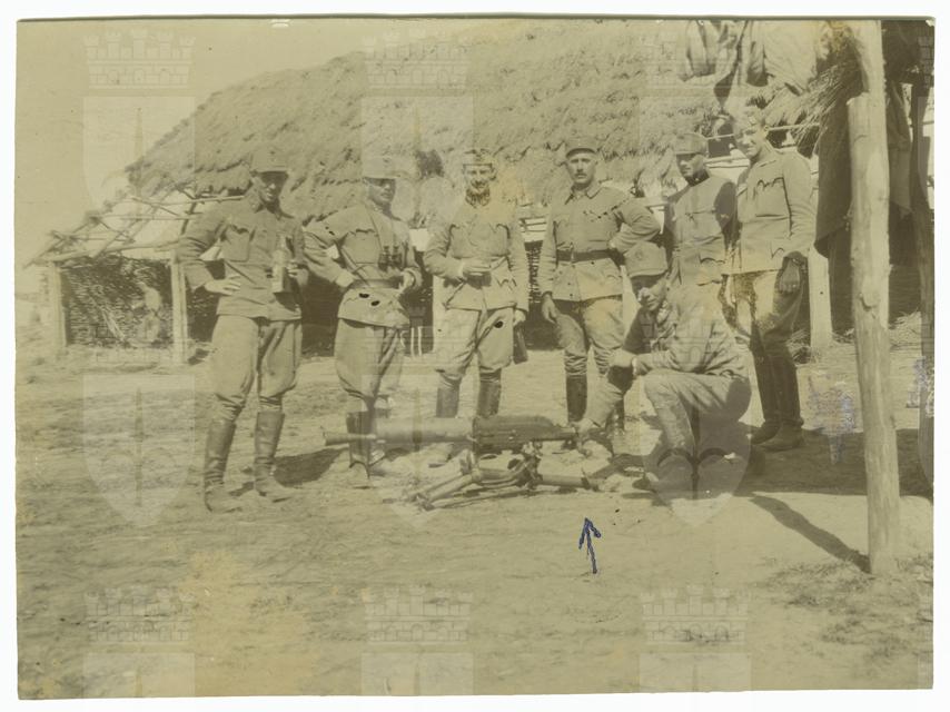 Ufficiali del 12. Reggimento Ulani e del 58. Reggimento Infanteria. Il quarto da sinistra, indicato da una freccia segnata a penna, e' il capitano Michele Chiachich. E' presente anche il capitano Pistor, forse il secondo da sinistra