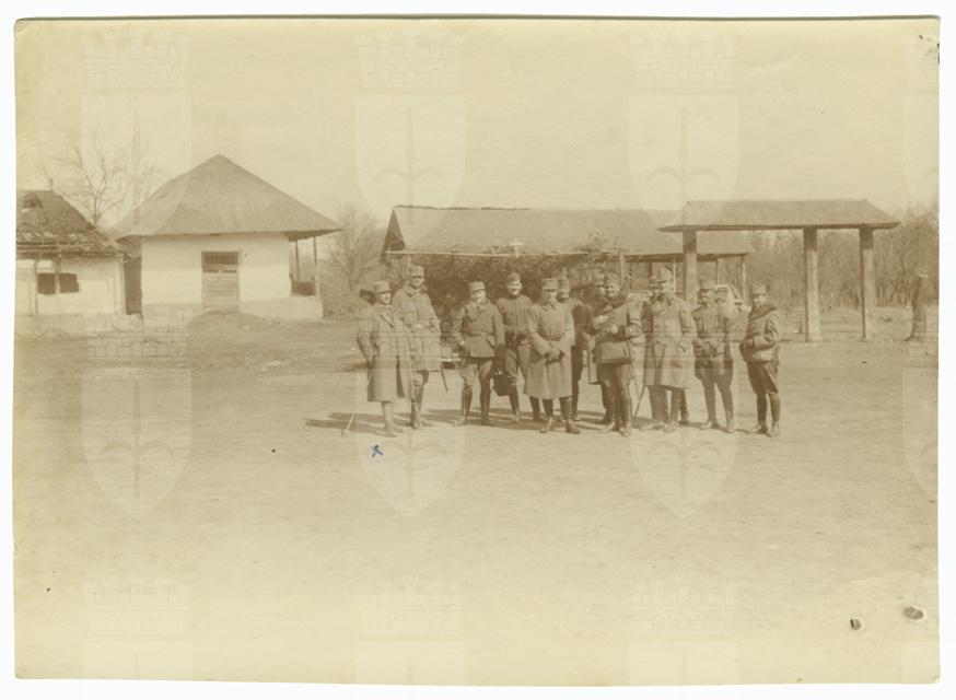 Gli ufficiali del 12. Reggimento Ulani dopo la Messa da campo a Vidra, distretto di Vrancea. Nel gruppo è presente anche il capitano Chiachich. Sull'immagine una piccola x indica il colonnello principe von Lichtenstein, comandante del reggimento