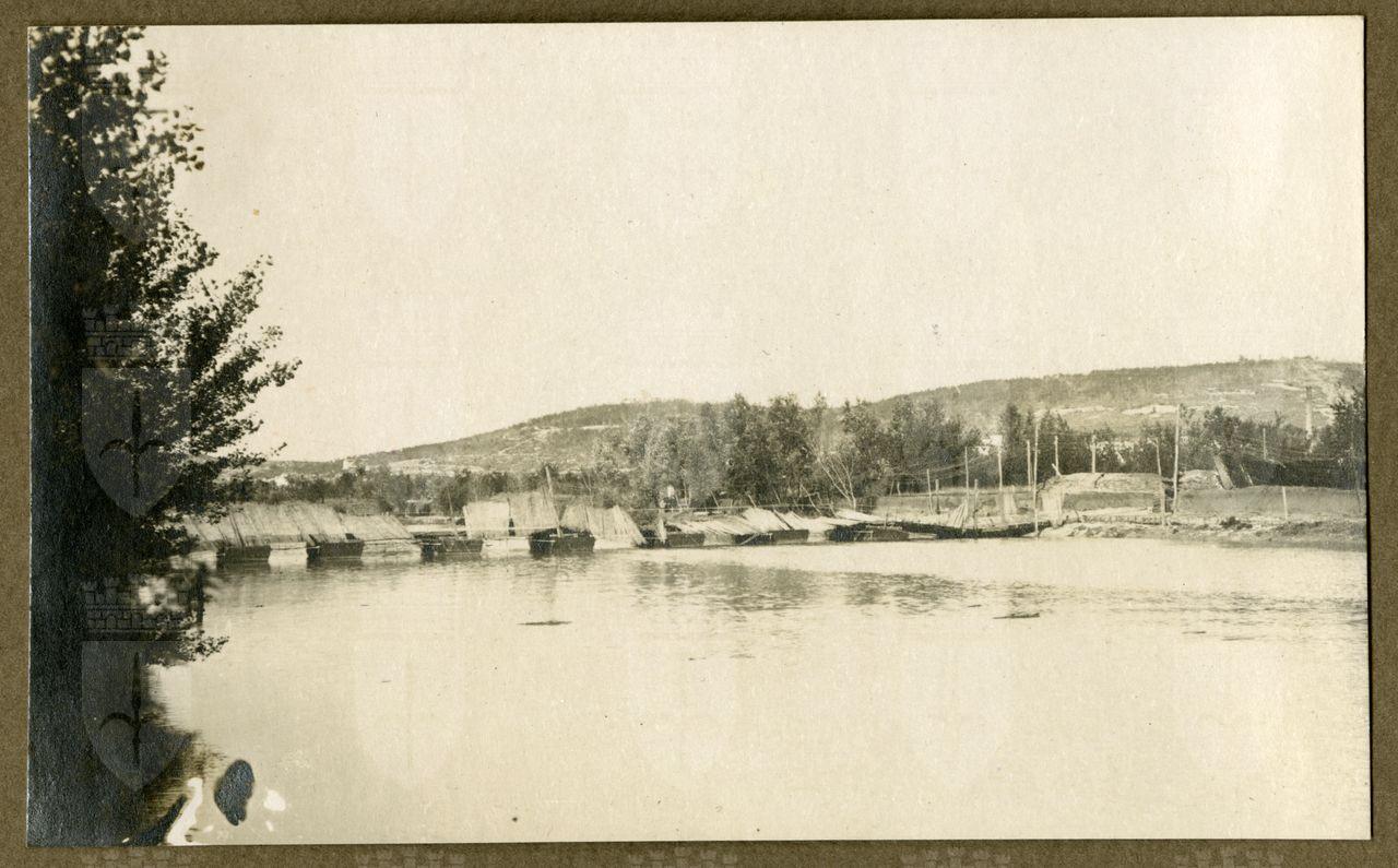 La foto ritrae il ponte di barche sul fiume Isonzo.