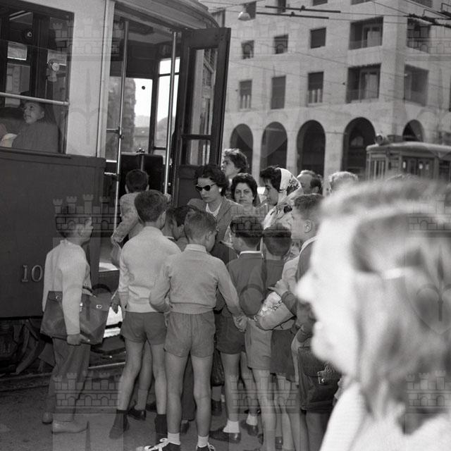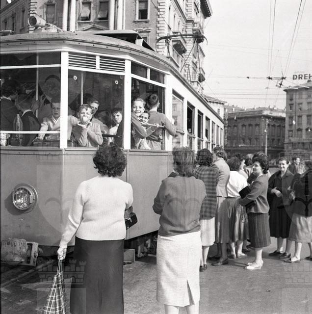 I bambini in Piazza Oberdan prendono il Tram che salendo per Via Cologna arriva ad Opicina