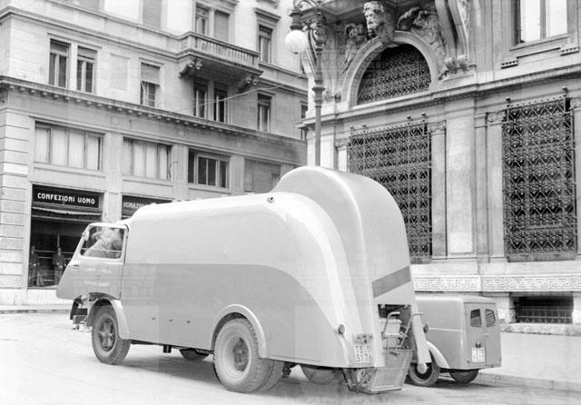 L'autocarro Bracchi Alessandri acquistato dall'amministrazione comunale prevede un nuovo sistema d'asporto delle immondizie. Lo scaricatore applica il bottino all'apposita apertura e il materiale viene aspirato.