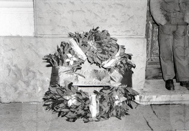 Due corone appese e una targa recante: Primi dalle navi d'Italia all'amplesso di Trieste balzarono i Bersaglieri III novembre MCMXVIII