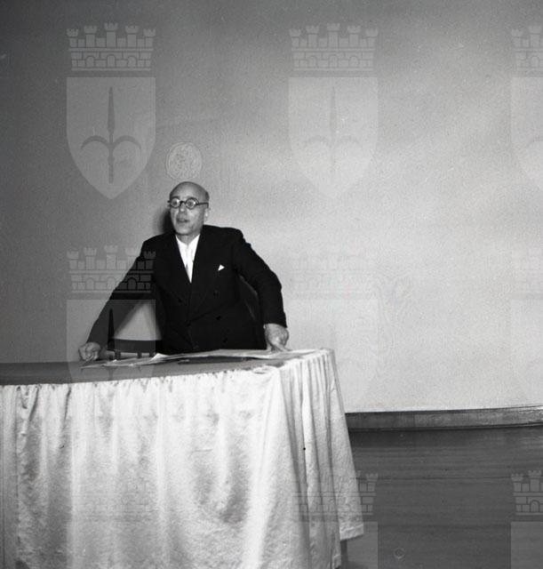 Il poeta Stefano Tuscano, pseudonimo di Stefano Benocci (1893-1966) viene a Trieste per parlare del sentimento dell'esilio in Dante. Apre la conferenza con una lirica dedicata a Trieste.