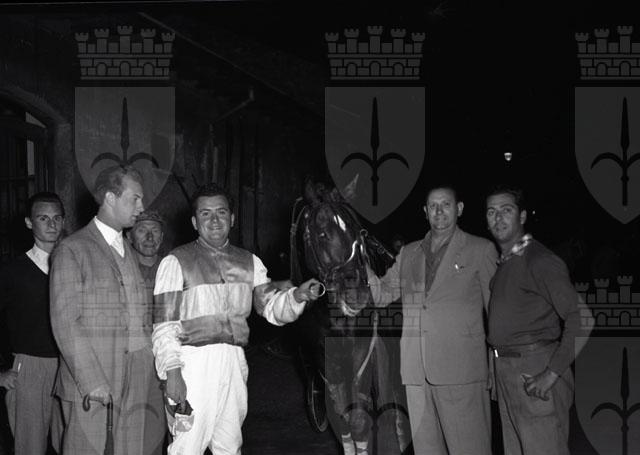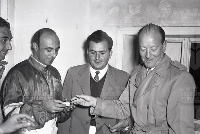 Vince la gara Bruno Vitaliano del Gazzettino Sera a cui viene consegnata una riproduzione del Campanone di San Giusto. Testo tratto dalle Ultime notizie, 24.09.1954