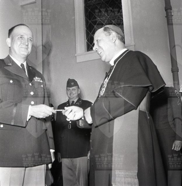 Il generale John A. Dabney consegna al vescovo Santin le chiavi della chiesetta di Banne. Il piccolo tempio, appartenuto a un patrizio triestino, è stato interamente ricostruito dal Genio americano (Giornalfoto, 17.10.1954)