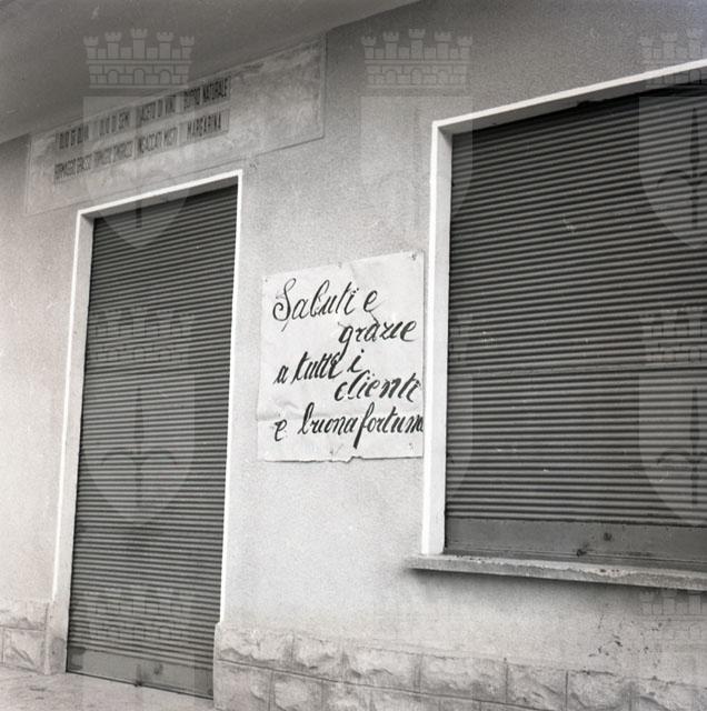 Sul muro di una casa un cartello con la scritta: Saluti e grazie a tutti i clienti e buona fortuna