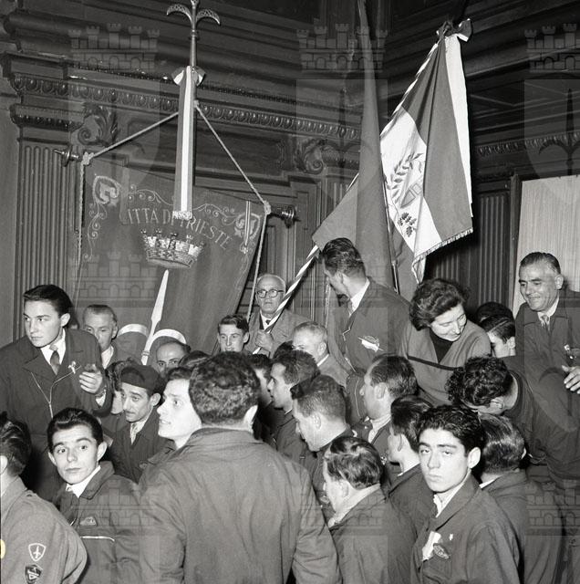 Un'autocolonna tricolore proveniente da Reggio Emilia che porta la prima bandiera tricolore della Repubblica Cisalpina donata dal Comune di Reggio Emilia alla città di San Giusto arriva il 31 ottobre in Piazza Unità. L'autocolonna viene prima ricevuta a Miramare e poi scortata fino a Piazza Unità da una colonna del Vespa Club. Testo tratto da Il Piccolo, 31.10.1954, p. 2.
