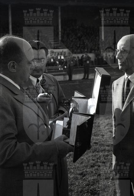 La squadra romana consegna la lupa in bronzo con una targa sulla quale sono espressi i sentimenti degli sportivi romani auspicando il prossimo ricongiungimento di Trieste all'Italia. Testo tratto dal Giornale di Trieste, 1.11.1953