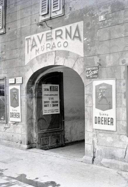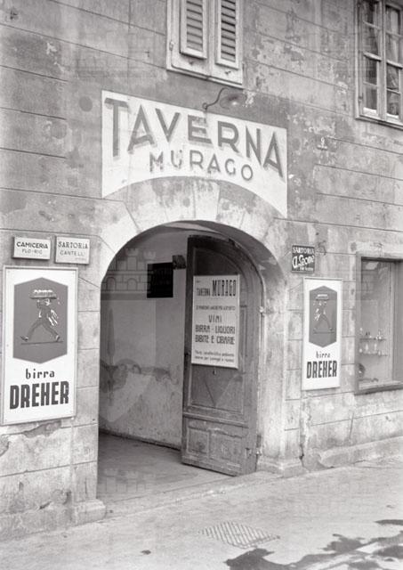 L'insegna della Taverna Murago che offre ai suoi clienti vini birra liquori bibite e cibarie, l'insegna pubblicitaria della birra Dreher e accanto le tabelle delle sartorie A.Leone, Cantelli e la camiceria FLO - RIG
