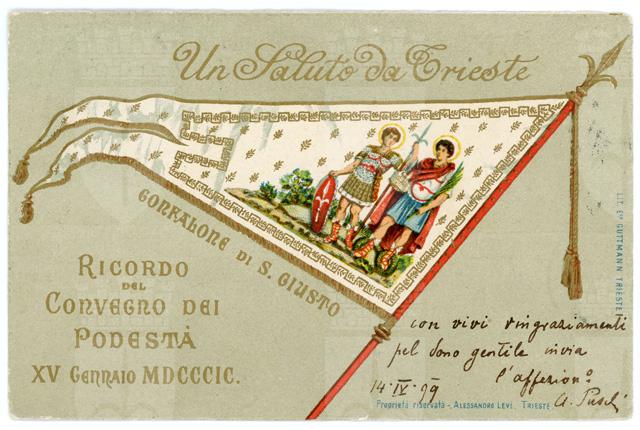 Cartolina commemorativa del convegno dei podestà raffigurante il Gonfalone di San Giusto