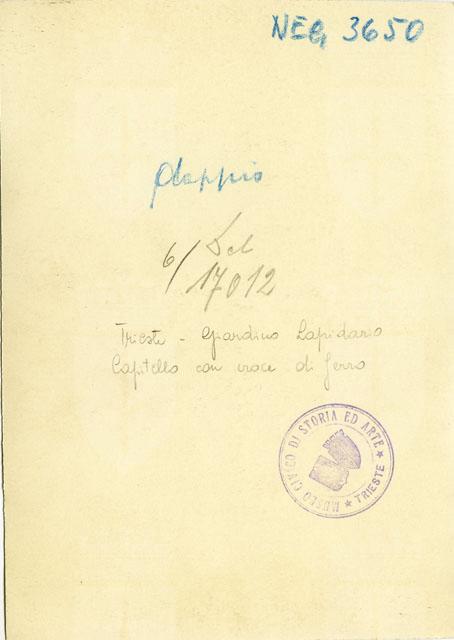 Capitello romano frammentario conservato presso l'Orto Lapidario del Museo di Storia ed Arte di Trieste. Sulla sommità del capitello è infissa una croce di ferro.