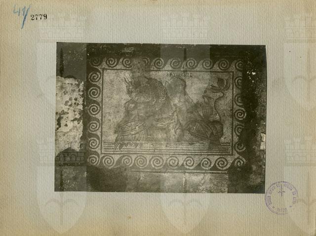 Particolare del mosaico che ornava il complesso noto in letteratura con il nome di "Grandi Terme", costruito ad Aquileia nel settore sud-occidentale della città antica in età tardocostantiniana. L'edificio, messo in luce negli anni Venti e attualmente in corso di scavo da parte dell'Università di Udine, è noto solo parzialmente: si conosce un ampio "frigidarium", collocato idealmente al centro del complesso, collegato in corrispondenza dei lati brevi mediante due lunghi corridoi a due aule simmetricamente opposte e di identiche dimensioni, interpretate come palestre "apodyteria". A est del frigidario era situata la piscina mentre alcune emergenze poste a ovest sembrerebbero riconducibili alla zona del calidario-tepidario. Completavano il complesso una serie di altri vani, alcuni dei quali riscaldati, posti nelle immediate vicinanze delle due ampie palestre. Le terme erano dotate di un ricco apparato decorativo di cui rimane testimonianza nei rivestimenti in marmo e in mosaico, come si evince dalla foto in esame. Il particolare qui riprodotto ornava l'aula Nord, caratterizzata da una composizione musiva piuttosto articolata (identica, nell'organizzazione, a quella dell'aula Sud): attorno a un grande quadrato centrale decorato da Nettuno sul carro si disponevano sedici pannelli campiti da fitti ornati geometrici impreziositi da personaggi del mondo marino, tra cui Nereidi e Tritoni, e figure di atleti. Chiudevano la decorazione in corrispondenza dei lati brevi due pannelli rettangolari, lunghi come l'ambiente, decorati da soggetti maschili, da interpretare verosimilmente come atleti. Il pannello della fotografia è posto a nord dell'ampio quadrato centrale e al suo interno, entro un bordo di onde correnti a giro multiplo, vi è la raffigurazione di una nereide identificabile con Clymene grazie all'iscrizione presente sopra la sua testa. La nereide siede sulle spire di un tritone, caratterizzato da chele di gambero sulla testa, che reca in mano un bacile colmo d'acqua. La figura è abbigliata con un mantello che le lascia scoperta parte del corpo e porta un diadema sul capo, la bulla intorno al collo e braccialetti sulle braccia, mentre con la mano sinistra regge un'idria baccellata. Si nota un restauro antico in tessere bianche che risarcisce una lacuna visibile a lato della testa del tritone fino alla cornice. Il pavimento si data al secondo quarto del IV sec. d.C.