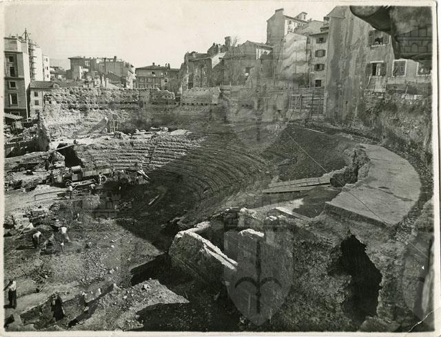 Veduta dello scavo del teatro romano nella zona di Donota in Cittavecchia ripresa dall'estremità sud-occidentale della cavea. La foto, scattata l'8 marzo del 1938, permette di constatare lo stato di avanzamento dei lavori che si concluderanno di lì a poco, il 21 aprile successivo, data dell'inaugurazione del monumento e della sua apertura al grande pubblico. Al momento dello scatto lo scavo ha messo in luce il muro perimetrale della cavea, la gradinata fino all'orchestra e sta proseguendo in corrispondenza della zona dell'orchestra e del frontescena, in corrispondenza del quale iniziano ad emergere i primi resti del muro di fondo.