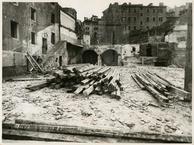 Demolizione degli edifici sorti sui resti del teatro romano nelle zone di Riborgo e Donota in Cittavecchia. La foto, scattata nel 1937, anno in cui iniziò lo sbancamento sistematico dell'area occupata dal monumento, riprende il settore interessato dall'estremità occidentale della cavea del teatro. Le operazioni di scavo, durate due soli anni, dal 1937 al 1938, permisero di mettere in luce il monumento antico nella sua intera estensione.