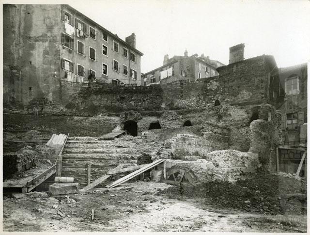 Scavo del teatro romano nella zona di Donota in Cittavecchia. La foto inquadra l'estremità occidentale della cavea, con il muro perimetrale e la gradinata liberata dall'interro moderno fino a circa metà dell'ima cavea. La foto, priva di data, può essere stata scattata tra i mesi finali del 1937 e quelli iniziali del 1938 in considerazione dello stato di avanzamento del cantiere. Le operazioni di scavo si conclusero il 21 aprile del 1938, giorno dell'inaugurazione del monumento e della sua apertura al pubblico.