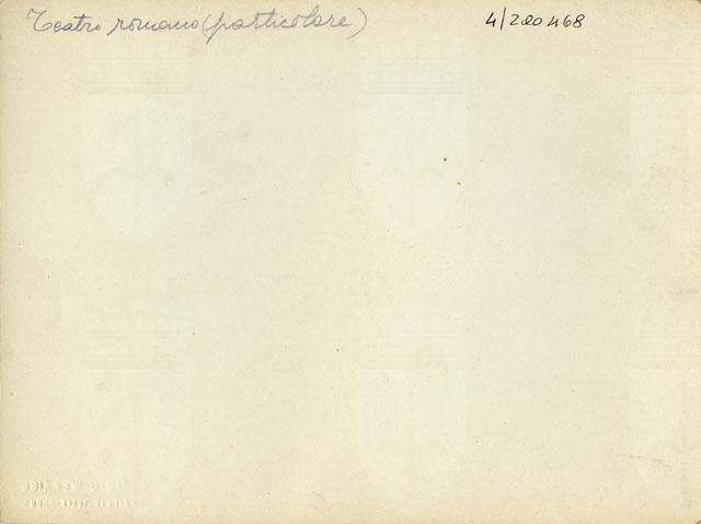 Scavo del teatro romano di Trieste./pLa foto inquadra il particolare del muro del frontescena nel tratto corrispondente all'apertura centrale, la porta regia, che si apriva sulla destra del pilastro. Lo scavo ha messo in luce la porzione inferiore del fondale scenico caratterizzato da un profilo a nicchie definito da una base marmorea modanata sui cui si imposta un nucleo interno in muratura. La buona conservazione dei resti ha consentito la ricostruzione pressoché completa del frontescena: al centro vi era un'esedra semicircolare dove si apriva la valva regia mentre ai lati trovavano posto due esedre rettangolari all'interno delle quali vi erano altre due aperture, le valvae hospitales. All'interno delle esedre, ai lati delle porte, erano collocate delle basi che forse sostenevano colonne posizionate ai lati degli accessi. Erano probabilmente destinate a impreziosire il frontescena le state rinvenute nel corso dello scavo, molte delle quali trovate proprio davanti alla scena, nell'iposcenio.
