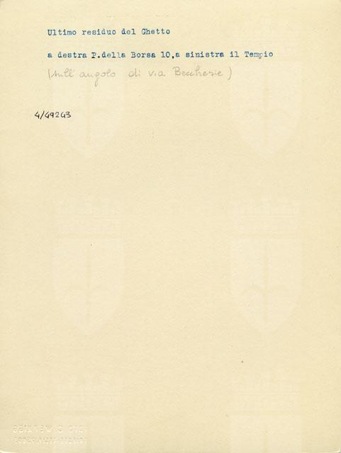 Tratto iniziale di via Beccherie, nei pressi di largo Riborgo, compreso nel piano di ristrutturazione urbanistica di Cittavecchia. Sulla destra c'è piazza della Borsa 10, a sinistra il Tempio israelitico ancora in piedi.