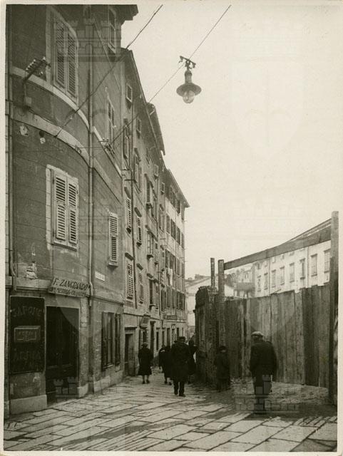 Via del Pozzo Bianco in Cittavecchia durante le demolizioni previste dal piano urbanistico fascista. Sulla sinistra le case ai civici nn. 123-122-121, sulla destra i resti della casa nn. 340-341 e la facciata della casa n. 343.