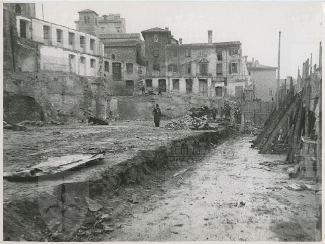 Demolizioni in Cittavecchia il 3 dicembre 1939. La foto inquadra i pochi resti delle case che sorgevano davanti alla chiesa di Santa Maria Maggiore e, sullo sfondo, la chiesetta di San Silvestro.