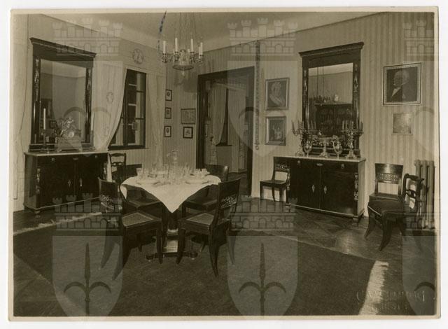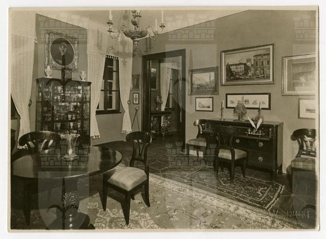Mostra La casa dei nostri nonni : grande salone stile impero, camera da letto stile impero, anticamera, salottino di musica Biedermeier, salottino, salotto Biedermeier, camera da pranzo stile impero, salotto Biedermeier